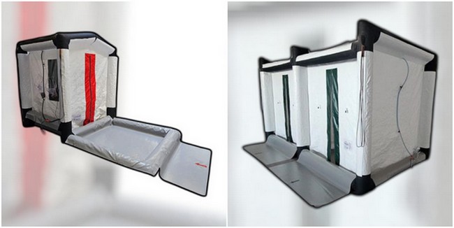 Gyors telepítésű pneumatikus fertőtlenítő zuhanykabinok. A felfújható vázzal egybe épített palást és alj, a kabin felfújása kb. 5 percet igényel, mely után rögtön a rendeltetésének megfelelően használható (zuhany, mentesitő kabinok).